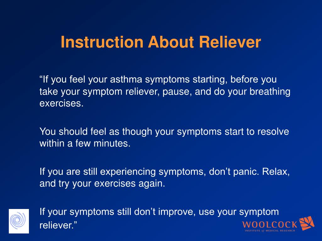 Instruction About Reliever “If you feel your asthma symptoms starting, before you take your symptom reliever, pause, and do your breathing exercises. You should feel as though your symptoms start to resolve within a few minutes. If you are still experiencing symptoms, don’t panic. Relax, and try your exercises again. If your symptoms still don’t improve, use your symptom reliever.”