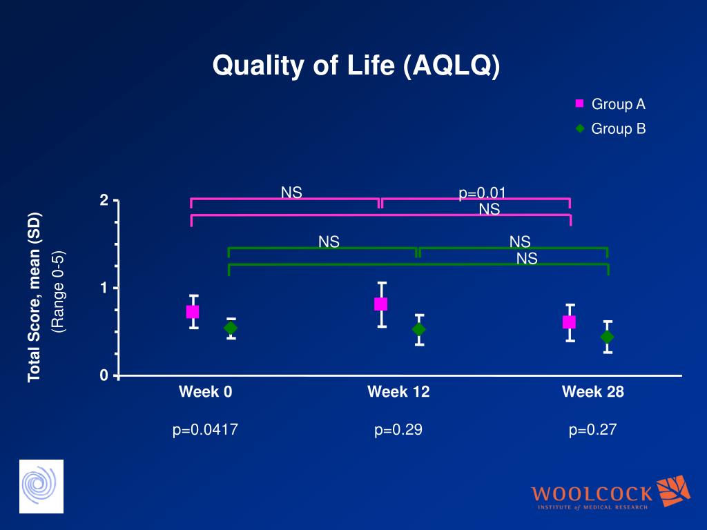 NS p=0.01 NS NS NS NS 2 1 (Range 0-5) Total Score, mean (SD) 0 Week 0 p=0.0417 Week 12 p=0.29 Week 28 p=0.27 Group A Group B Quality of Life (AQLQ)