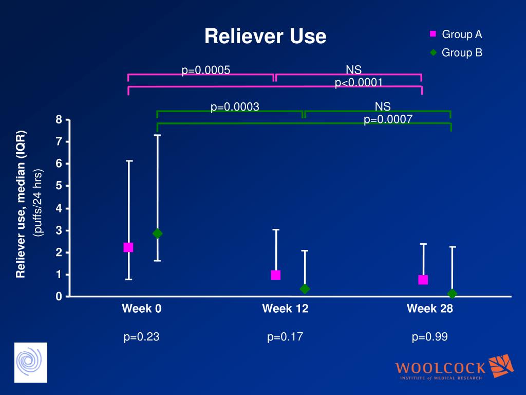 p=0.0005 NS p<0.0001 p=0.0003 NS p=0.0007 8 7 6 5 (puffs/24 hrs) Reliever use, median (IQR) 4 3 2 Week 0 p=0.23 Week 12 p=0.17 Week 28 p=0.99 1 0 Group A Group B RelieverUse