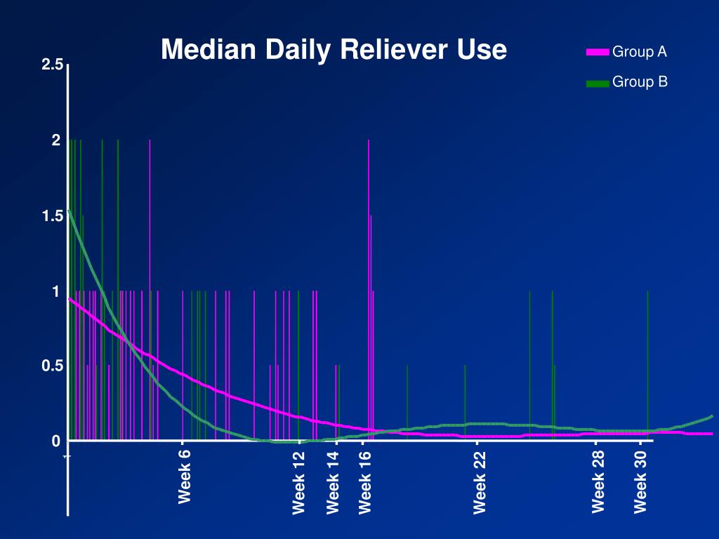 Median Daily RelieverUse Group A 2.5 Group B 2 1.5 1 0.5 0 1 Week 6 Week 30 Week 28 Week 12 Week 14 Week 16 Week 22