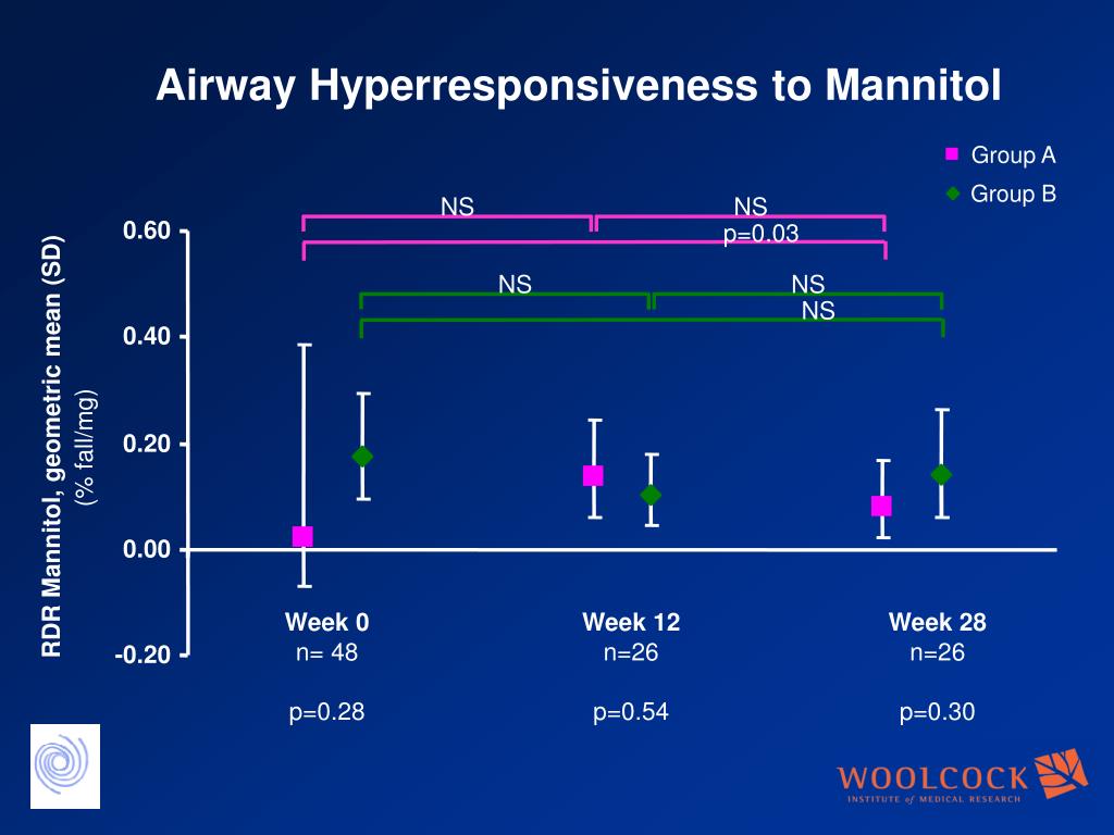 NS NS p=0.03 0.60 NS NS NS 0.40 0.20 RDR Mannitol, geometric mean (SD) (% fall/mg) 0.00 Week 0 n= 48 p=0.28 Week 12 n=26 p=0.54 Week 28 n=26 p=0.30 -0.20 Group A Group B Airway Hyperresponsiveness to Mannitol