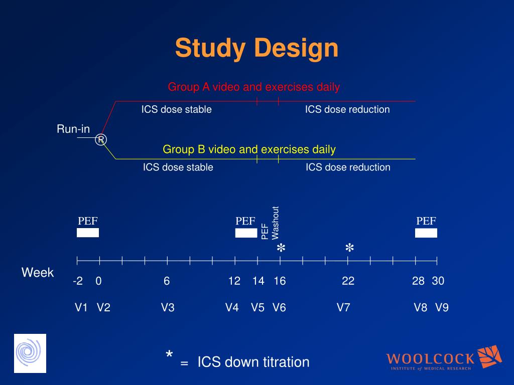 Group A video and exercises daily ICS dose stable ICS dose reduction Run-in Group B video and exercises daily ICS dose stable ICS dose reduction PEF Washout PEF PEF PEF * * 30 -2 0 6 12 14 16 22 28 V2 V3 V4 V5 V6 V7 V8 V9 V1 Study Design Week * = ICS down titration
