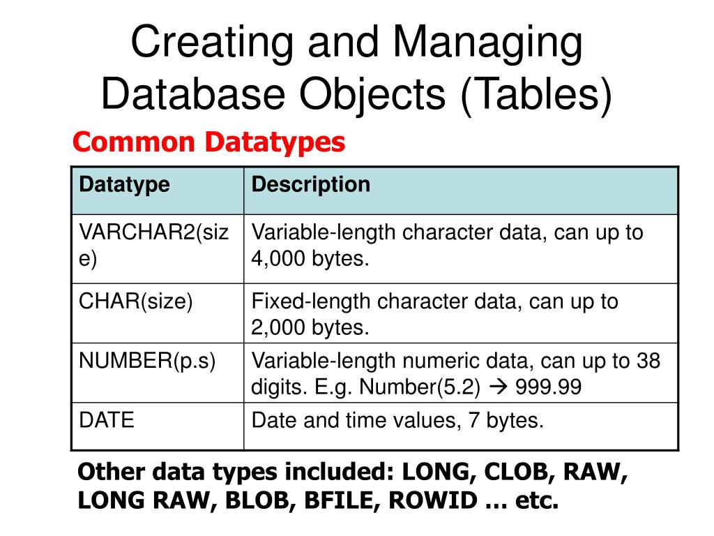 Creating and Managing Database Objects (Tables) Common Datatypes Other data types included: LONG, CLOB, RAW, LONG RAW, BLOB, BFILE, ROWID … etc.