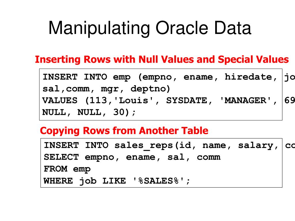 Manipulating Oracle Data Inserting Rows with Null Values and Special Values INSERT INTO emp (empno, ename, hiredate, job, sal,comm, mgr, deptno) VALUES (113,'Louis', SYSDATE, 'MANAGER', 6900, NULL, NULL, 30); Copying Rows from Another Table INSERT INTO sales_reps(id, name, salary, com) SELECT empno, ename, sal, comm FROM emp WHERE job LIKE '%SALES%';
