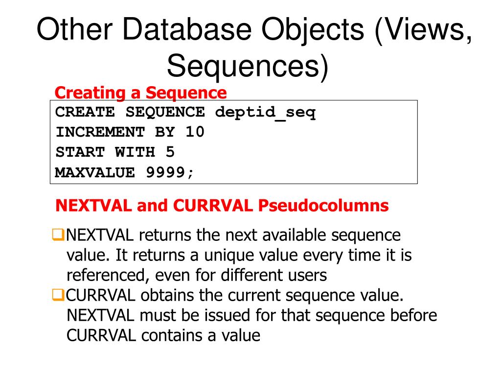 Other Database Objects (Views, Sequences) Creating a Sequence CREATE SEQUENCE deptid_seq INCREMENT BY 10 START WITH 5 MAXVALUE 9999; NEXTVAL and CURRVAL Pseudocolumns • NEXTVAL returns the next available sequence value. It returns a unique value every time it is referenced, even for different users • CURRVAL obtains the current sequence value. NEXTVAL must be issued for that sequence before CURRVAL contains a value