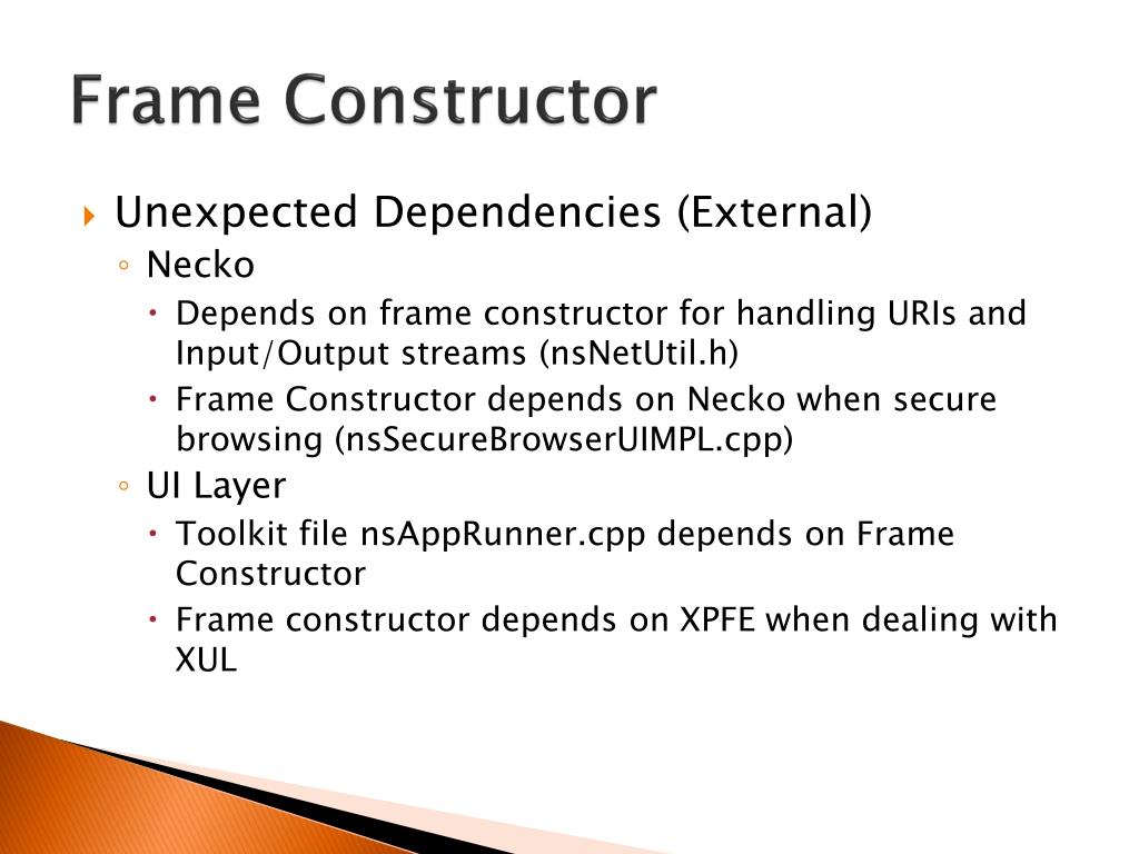 Frame Constructor • Unexpected Dependencies (External) • Necko • Depends on frame constructor for handling URIs and Input/Output streams (nsNetUtil.h) • Frame Constructor depends on Necko when secure browsing (nsSecureBrowserUIMPL.cpp) • UI Layer • Toolkit file nsAppRunner.cpp depends on Frame Constructor • Frame constructor depends on XPFE when dealing with XUL