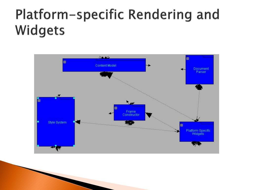 Frame Constructor • Unexpected Dependencies (Internal) • Document Parser • nsHTMLParts.h calls nsHTMLContentSink.cpp - nsHTMLParts retrieves HTML data from the content sink used for the content model for additional frame-state bits used by the Frame Constructor • Platform Specific Widgets • Contains a large number of widgets such as nsIPluginWidget.cpp for mac-specific frame rendering, and nsNativeWidget.cpp which deals with platform-specific rendering
