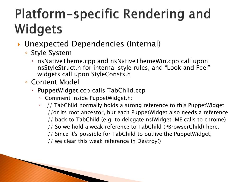 Platform-specific Rendering and Widgets • Unexpected Dependencies (Internal) • Style System • nsNativeTheme.cpp and nsNativeThemeWin.cpp call upon nsStyleStruct.h for internal style rules, and “Look and Feel” widgets call upon StyleConsts.h • Content Model • PuppetWidget.ccp calls TabChild.ccp • Comment inside PuppetWidget.h: • // TabChild normally holds a strong reference to this PuppetWidget //or its root ancestor, but each PuppetWidget also needs a reference // back to TabChild (e.g. to delegate nsIWidget IME calls to chrome) // So we hold a weak reference to TabChild (PBrowserChild) here. // Since it's possible for TabChild to outlive the PuppetWidget, // we clear this weak reference in Destroy()