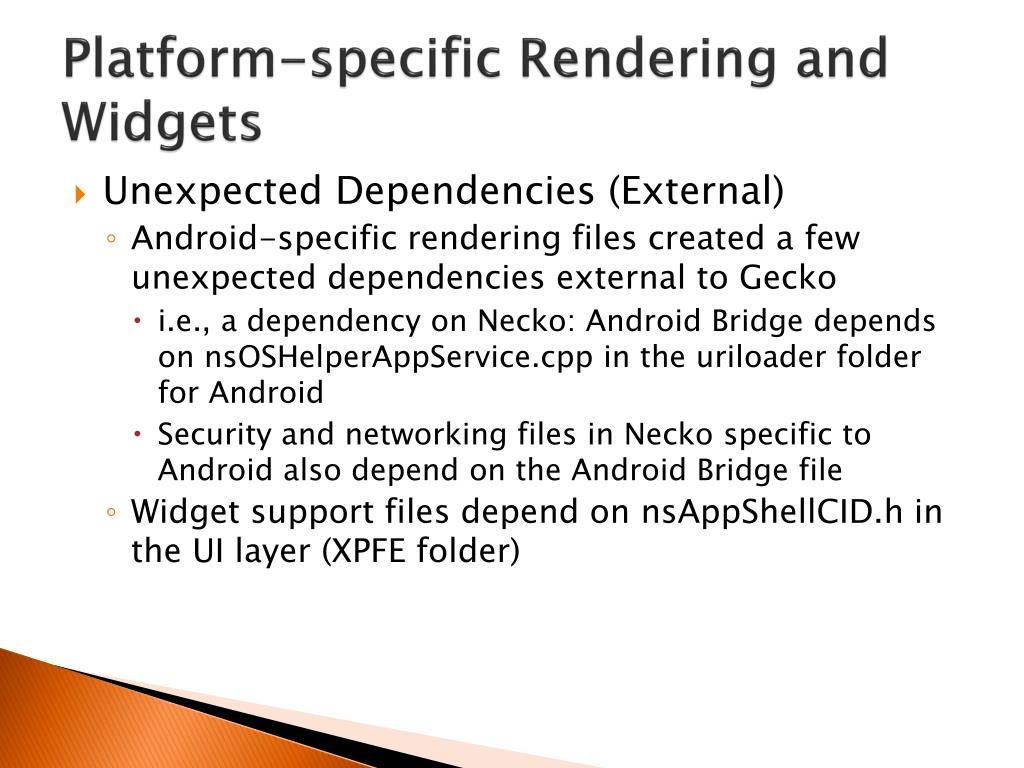 Platform-specific Rendering and Widgets • Unexpected Dependencies (External) • Android-specific rendering files created a few unexpected dependencies external to Gecko • i.e., a dependency on Necko: Android Bridge depends on nsOSHelperAppService.cpp in the uriloader folder for Android • Security and networking files in Necko specific to Android also depend on the Android Bridge file • Widget support files depend on nsAppShellCID.h in the UI layer (XPFE folder)