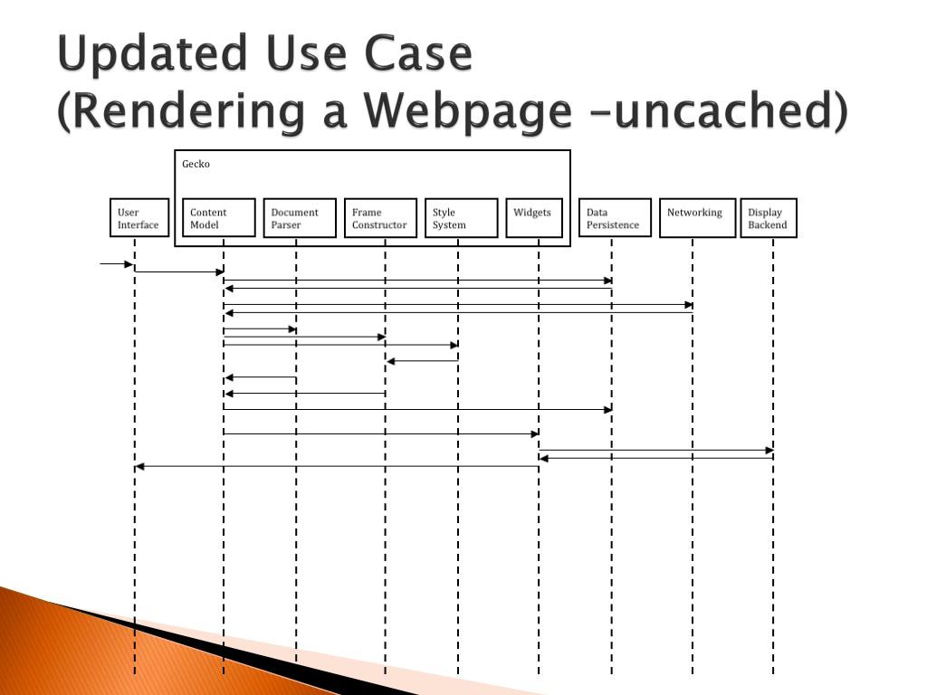 Document Parser • Unexpected Dependencies (Internal) • Content Model • The HTML Parser needs access to HTML form constants and processes • Access to nsEventStates.h in order to inform the content model of any Html changes within the parser. • Unexpected Dependencies (External) • Display Backend • The Display Backend calls HTML5Parser.cpp and HTML5StreamParser.cpp to retrieve HTML 5 data • UI Layer • UI Layer takes HTML code and converts it to plain text (nsScriptableUnescapeHTML.cpp)