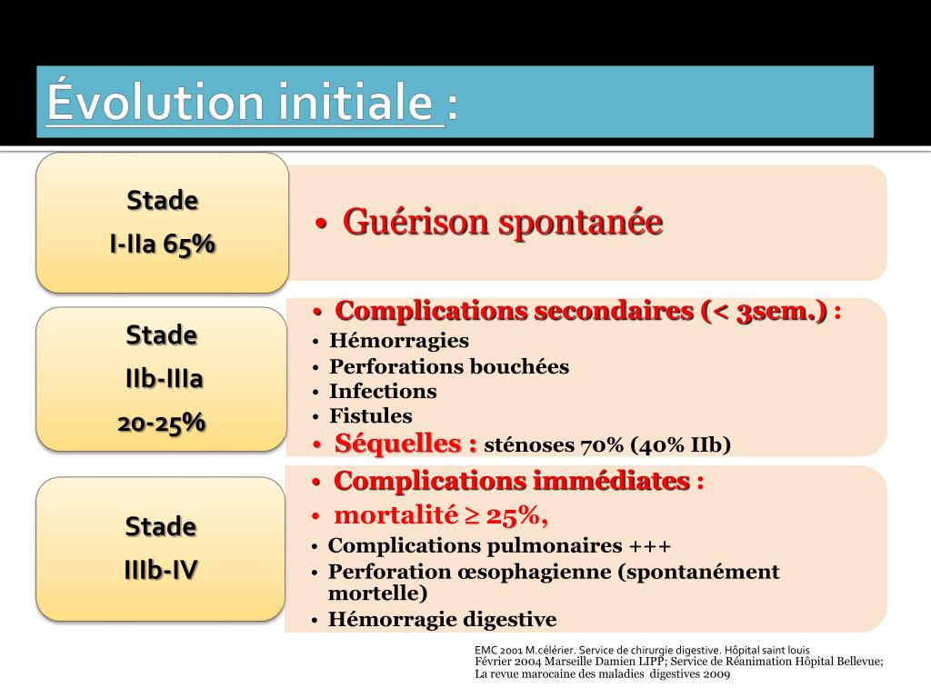 Évolution initiale : EMC 2001 M.célérier. Service de chirurgie digestive. Hôpital saint louis Février 2004 Marseille Damien LIPP; Service de Réanimation Hôpital Bellevue; La revue marocaine des maladies digestives 2009