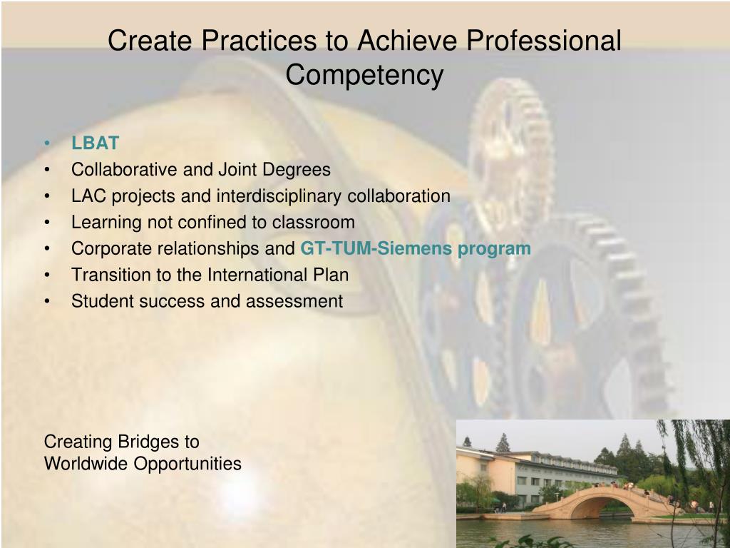 Create Practices to Achieve Professional Competency • LBAT • Collaborative and Joint Degrees • LAC projects and interdisciplinary collaboration • Learning not confined to classroom • Corporate relationships and GT-TUM-Siemens program • Transition to the International Plan • Student success and assessment Creating Bridges toWorldwide Opportunities
