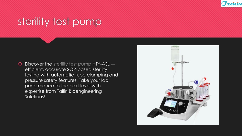 sterility test pump • Discover the sterility test pump HTY‑ASL — efficient, accurate SOP‑based sterility testing with automatic tube clamping and pressure safety features. Take your lab performance to the next level with expertise from Tailin Bioengineering Solutions!