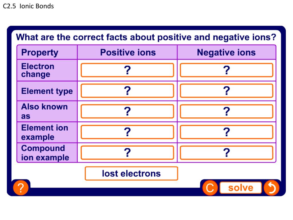 C2.5 Ionic Bonds chlorine atom = 2.8.7 chloride ion = Cl- (not Cl1-) oxide ion = O2- oxygen atom = 2.6 nitrogen atom = 2.5 nitride ion = N3- Negative ions An atom that gains one or more electrons forms anegative ion. Non-metal atoms, such as chlorine, oxygen and nitrogen,form positive ions. Negative ions have a small ‘-’ symbol and a number by them to indicate how many electrons they have gained to fill their outer shell. For example: The name of the ion is slightly different to that of the atom – it ends with ‘–ide’.