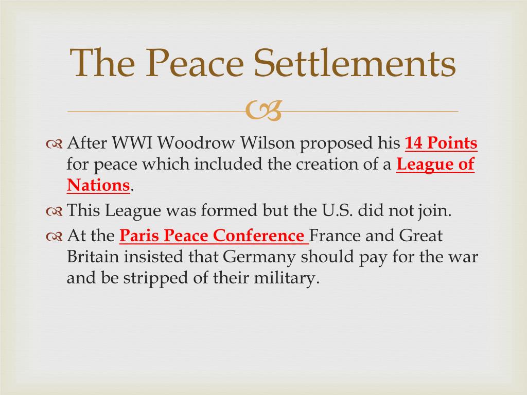 The Peace Settlements • After WWI Woodrow Wilson proposed his 14 Points for peace which included the creation of a League of Nations. • This League was formed but the U.S. did not join. • At the Paris Peace Conference France and Great Britain insisted that Germany should pay for the war and be stripped of their military.
