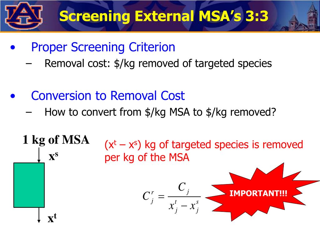 Screening External MSA’s 3:3 • Proper Screening Criterion • Removal cost: $/kg removed of targeted species • Conversion to Removal Cost • How to convert from $/kg MSA to $/kg removed? (xt – xs) kg of targeted species is removed per kg of the MSA IMPORTANT!!! (3.30)