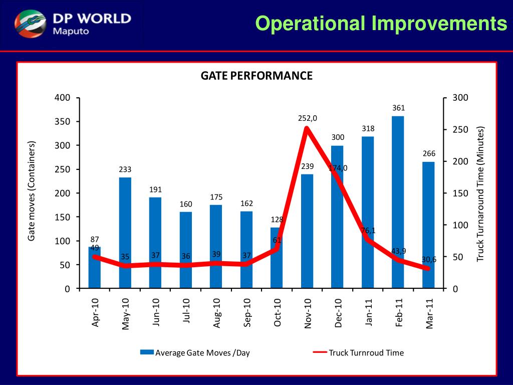 Operational Objectives • Determined to transfer Maputo Container Terminal into a World Wide performing terminal. • Achieve by May 2011 • 17.5 BMPH and 10 GMPH • 30 min Truck turnaround time • Below 24hours Vessel waiting time • 24/7 gate availability to receive and deliver containers • Work towards acquiring the ISO 28000 security certificate • Evaluate and improve the company structure