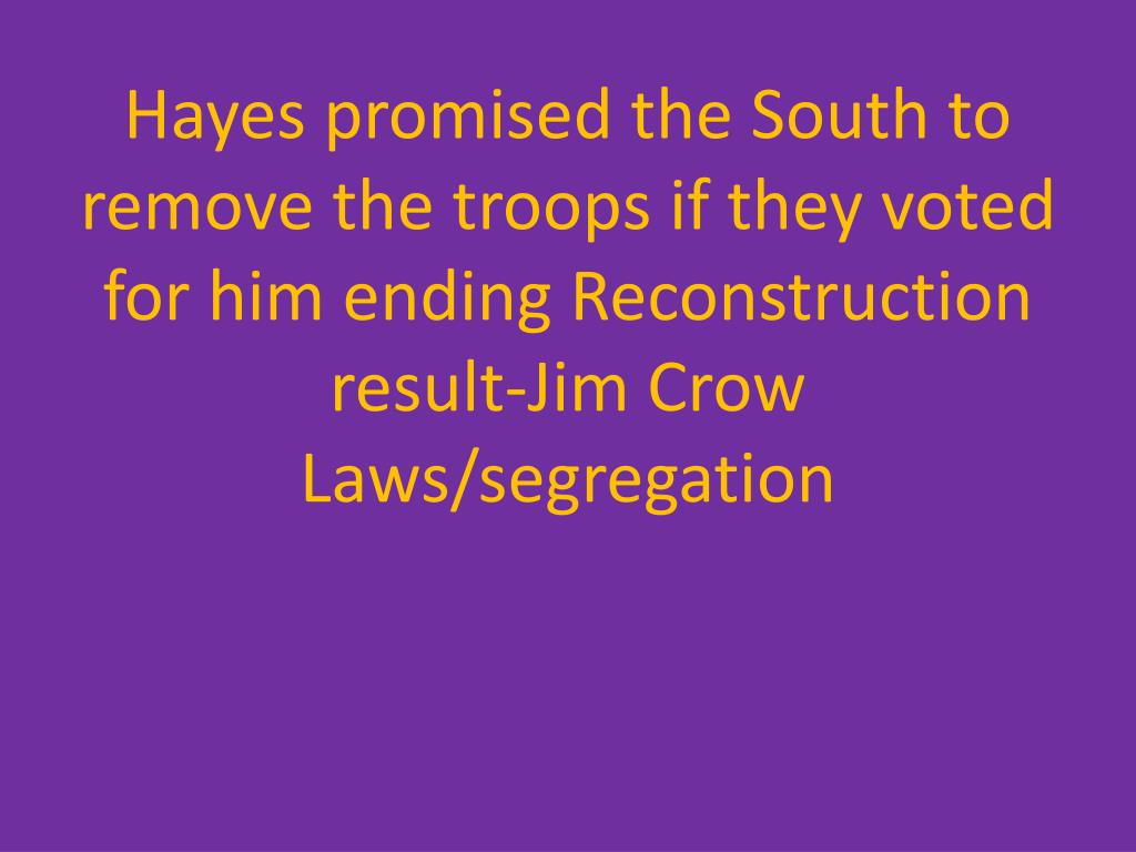 Hayes promised the South to remove the troops if they voted for him ending Reconstructionresult-Jim Crow Laws/segregation