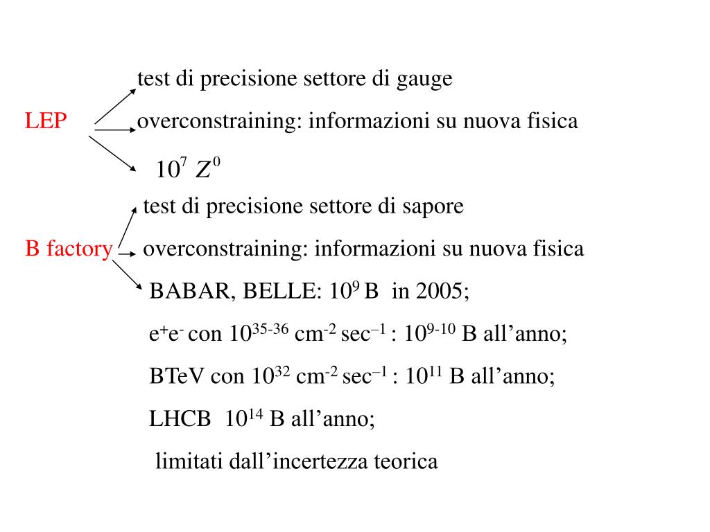 test di precisione settore di gauge LEP overconstraining: informazioni su nuova fisica test di precisione settore di sapore B factory overconstraining: informazioni su nuova fisica BABAR, BELLE: 109 B in 2005; e+e- con 1035-36 cm-2 sec–1 : 109-10 B all’anno; BTeV con 1032 cm-2 sec–1 : 1011 B all’anno; LHCB 1014 B all’anno; limitati dall’incertezza teorica