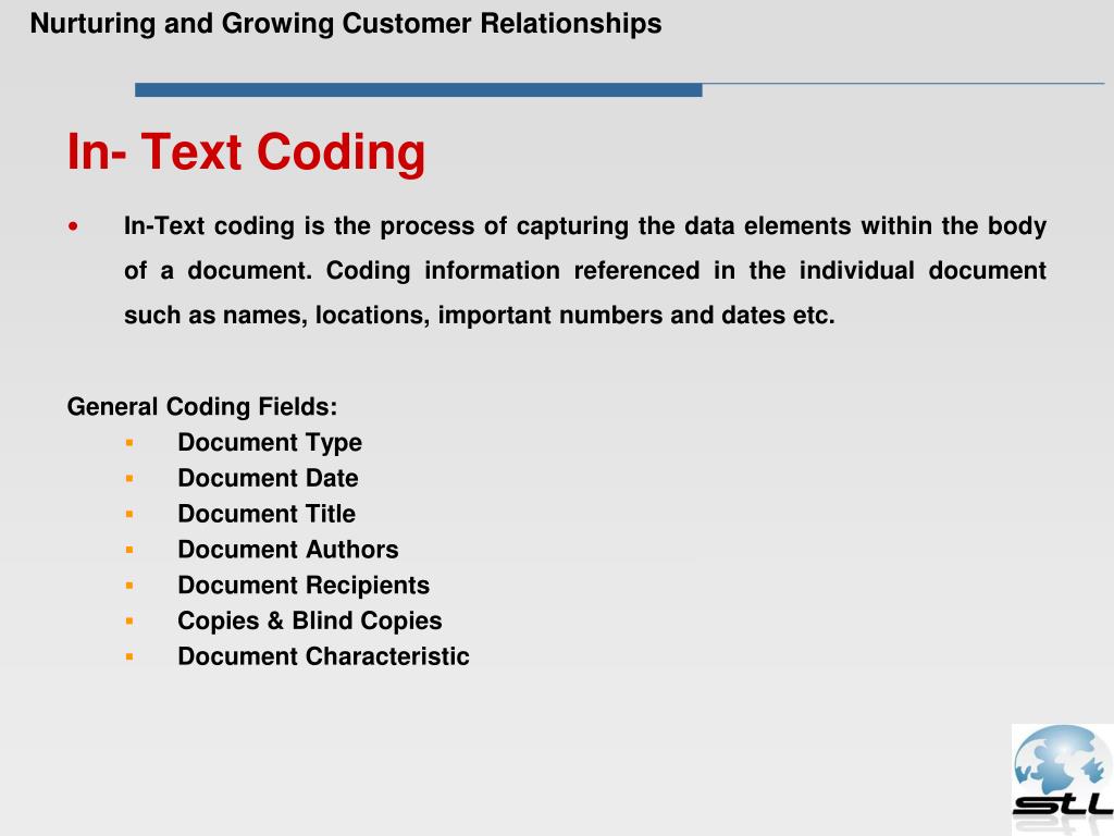 In-Text coding is the process of capturing the data elements within the body of a document. Coding information referenced in the individual document such as names, locations, important numbers and dates etc. General Coding Fields: Document Type Document Date Document Title Document Authors Document Recipients Copies & Blind Copies Document Characteristic Nurturing and Growing Customer Relationships In- Text Coding