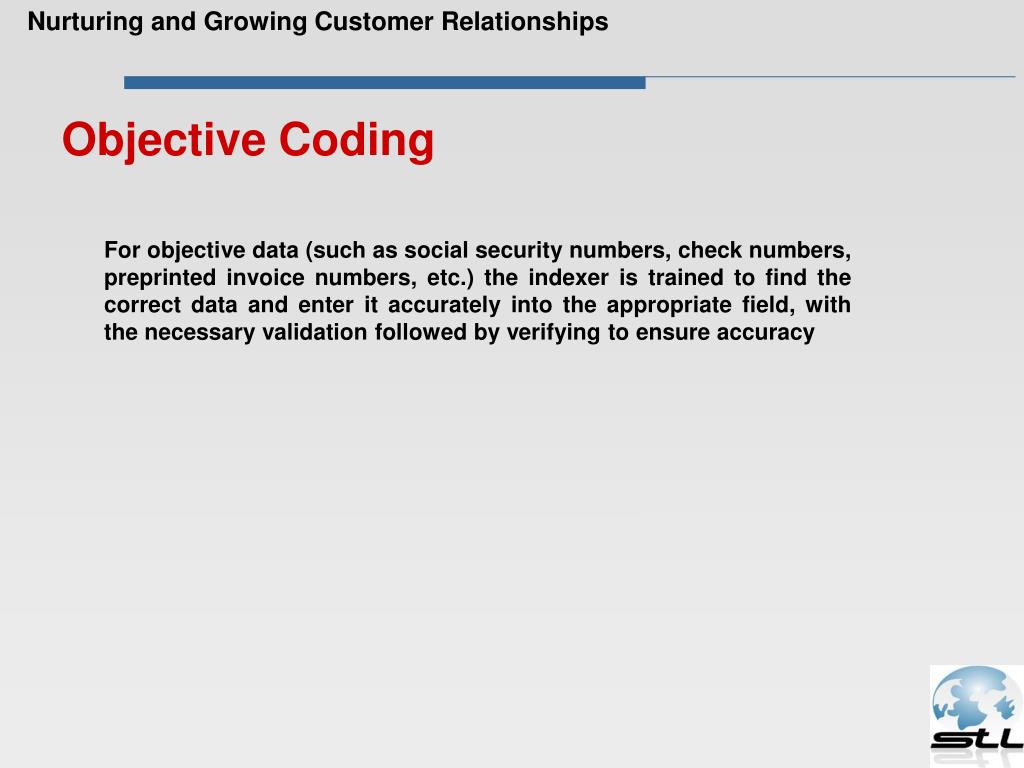 Nurturing and Growing Customer Relationships Objective Coding For objective data (such as social security numbers, check numbers, preprinted invoice numbers, etc.) the indexer is trained to find the correct data and enter it accurately into the appropriate field, with the necessary validation followed by verifying to ensure accuracy
