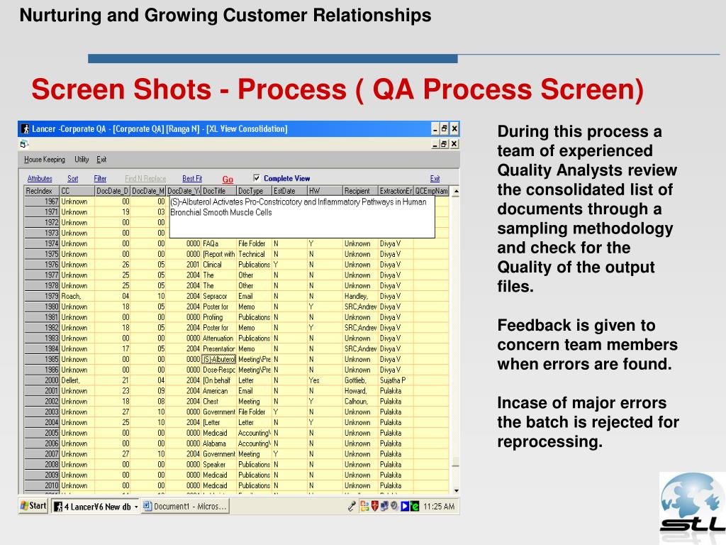 Screen Shots - Process ( QA Process Screen) Nurturing and Growing Customer Relationships During this process a team of experienced Quality Analysts review the consolidated list of documents through a sampling methodology and check for the Quality of the output files. Feedback is given to concern team members when errors are found. Incase of major errors the batch is rejected for reprocessing.