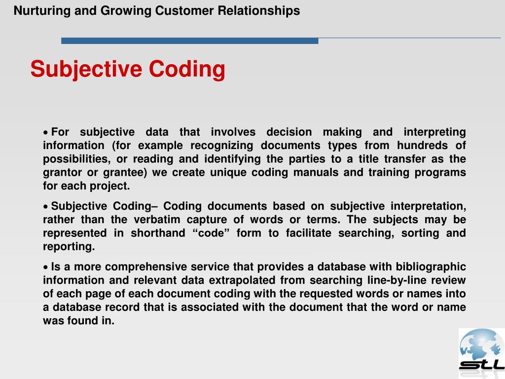 Logical Document Determination Bibliographic Coding Subjective Coding Objective Coding In text Coding Electronic Data Discovery Nurturing and Growing Customer Relationships Litigation Support services and EDD