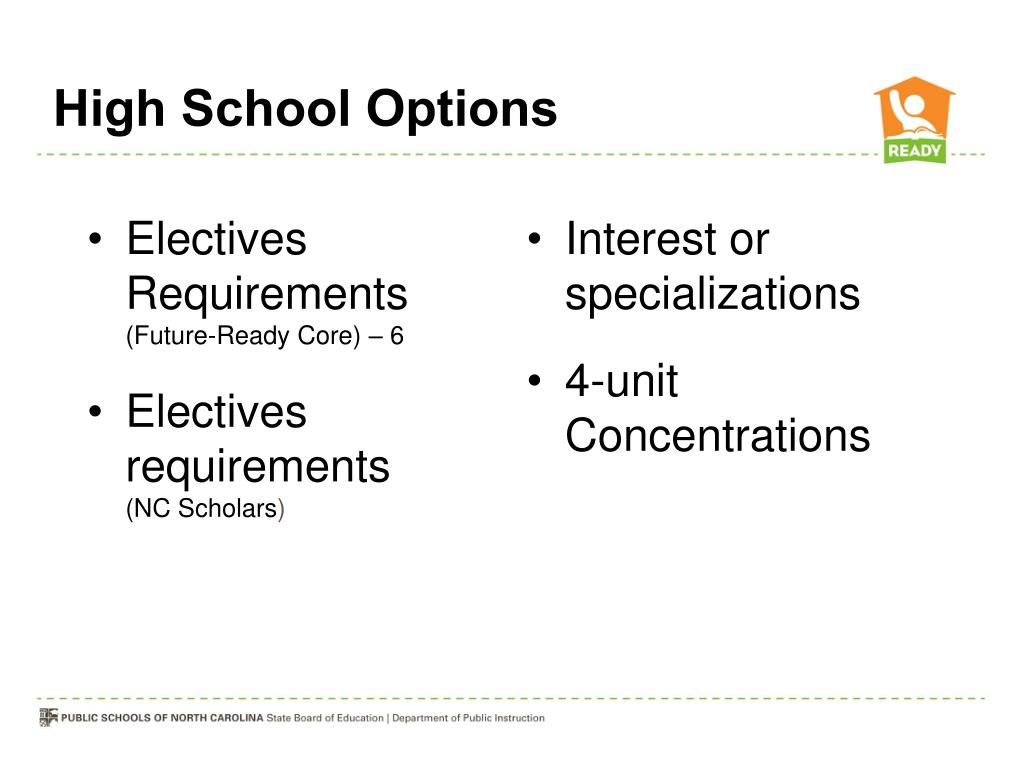 High School Options • Electives Requirements (Future-Ready Core) – 6 • Electives requirements (NC Scholars) • Interest or specializations • 4-unit Concentrations