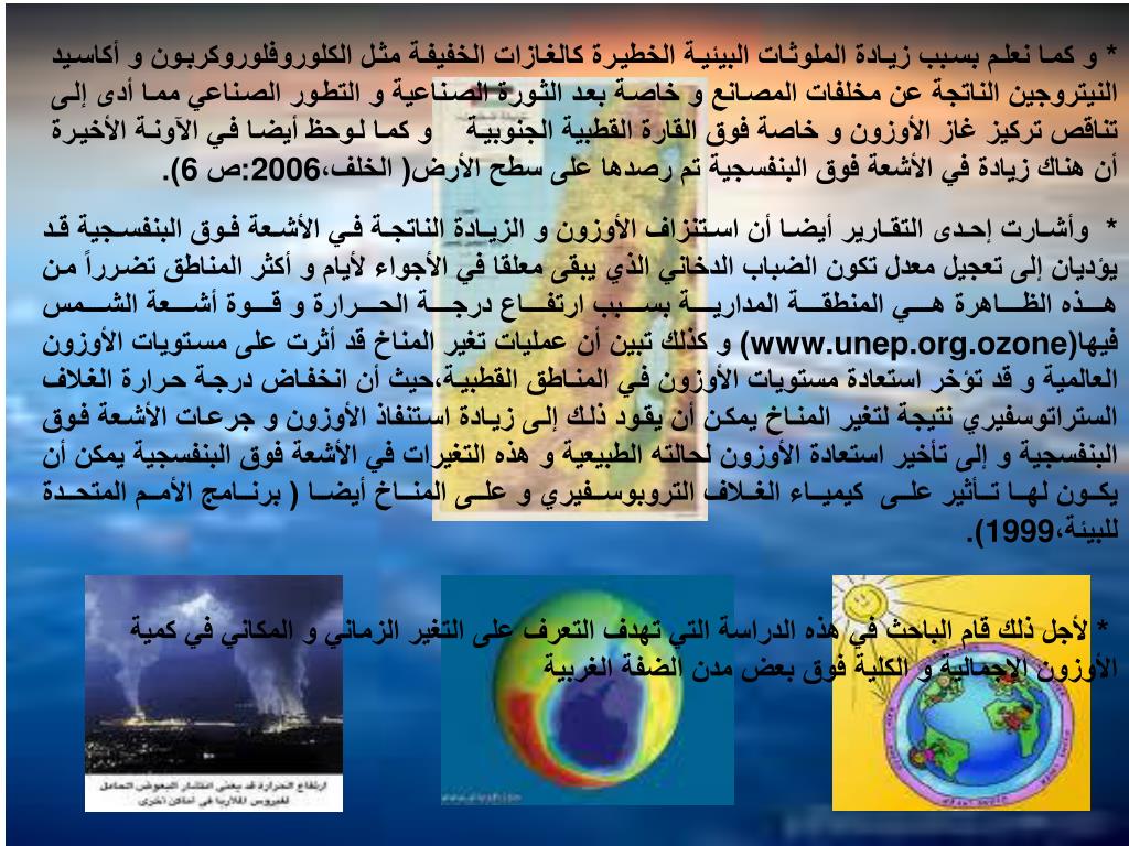 * و كما نعلم بسبب زيادة الملوثات البيئية الخطيرة كالغازات الخفيفة مثل الكلوروفلوروكربون و أكاسيد النيتروجين الناتجة عن مخلفات المصانع و خاصة بعد الثورة الصناعية و التطور الصناعي مما أدى إلى تناقص تركيز غاز الأوزون و خاصة فوق القارة القطبية الجنوبية و كما لوحظ أيضا في الآونة الأخيرة أن هناك زيادة في الأشعة فوق البنفسجية تم رصدها على سطح الأرض( الخلف،2006:ص 6). * وأشارت إحدى التقارير أيضا أن استنزاف الأوزون و الزيادة الناتجة في الأشعة فوق البنفسجية قد يؤديان إلى تعجيل معدل تكون الضباب الدخاني الذي يبقى معلقا في الأجواء لأيام و أكثر المناطق تضرراً من هذه الظاهرة هي المنطقة المدارية بسبب ارتفاع درجة الحرارة و قوة أشعة الشمس فيها(www.unep.org.ozone) و كذلك تبين أن عمليات تغير المناخ قد أثرت على مستويات الأوزون العالمية و قد تؤخر استعادة مستويات الأوزون في المناطق القطبية،حيث أن انخفاض درجة حرارة الغلاف الستراتوسفيري نتيجة لتغير المناخ يمكن أن يقود ذلك إلى زيادة استنفاذ الأوزون و جرعات الأشعة فوق البنفسجية و إلى تأخير استعادة الأوزون لحالته الطبيعية و هذه التغيرات في الأشعة فوق البنفسجية يمكن أن يكون لها تأثير على كيمياء الغلاف التروبوسفيري و على المناخ أيضا ( برنامج الأمم المتحدة للبيئة،1999). * لأجل ذلك قام الباحث في هذه الدراسة التي تهدف التعرف على التغير الزماني و المكاني في كمية الأوزون الإجمالية و الكلية فوق بعض مدن الضفة الغربية