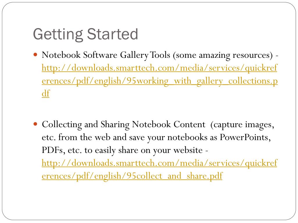 Getting Started • Notebook Software Gallery Tools (some amazing resources) - http://downloads.smarttech.com/media/services/quickreferences/pdf/english/95working_with_gallery_collections.pdf • Collecting and Sharing Notebook Content (capture images, etc. from the web and save your notebooks as PowerPoints, PDFs, etc. to easily share on your website - http://downloads.smarttech.com/media/services/quickreferences/pdf/english/95collect_and_share.pdf