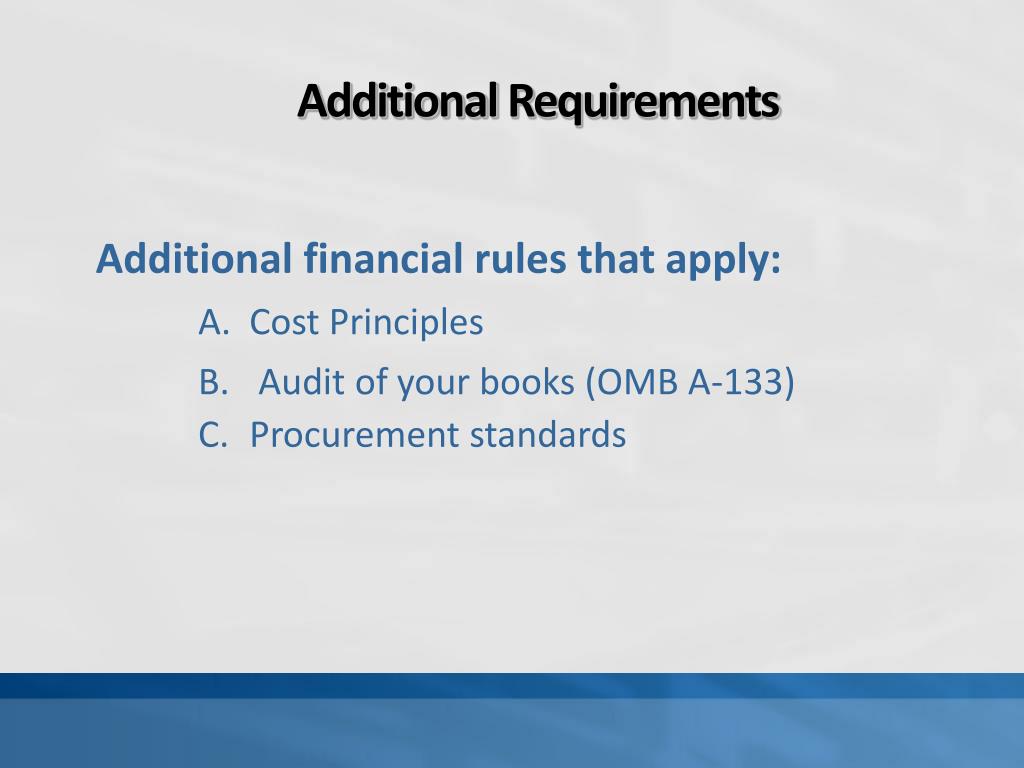 AdditionalRequirements Additional financial rules that apply: • Cost Principles • Audit of your books (OMB A-133) • Procurement standards
