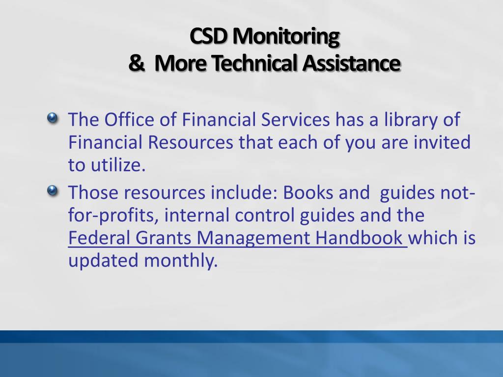 CSD Monitoring& More Technical Assistance • The Office of Financial Services has a library of Financial Resources that each of you are invited to utilize. • Those resources include: Books and guides not-for-profits, internal control guides and the Federal Grants Management Handbook which is updated monthly.