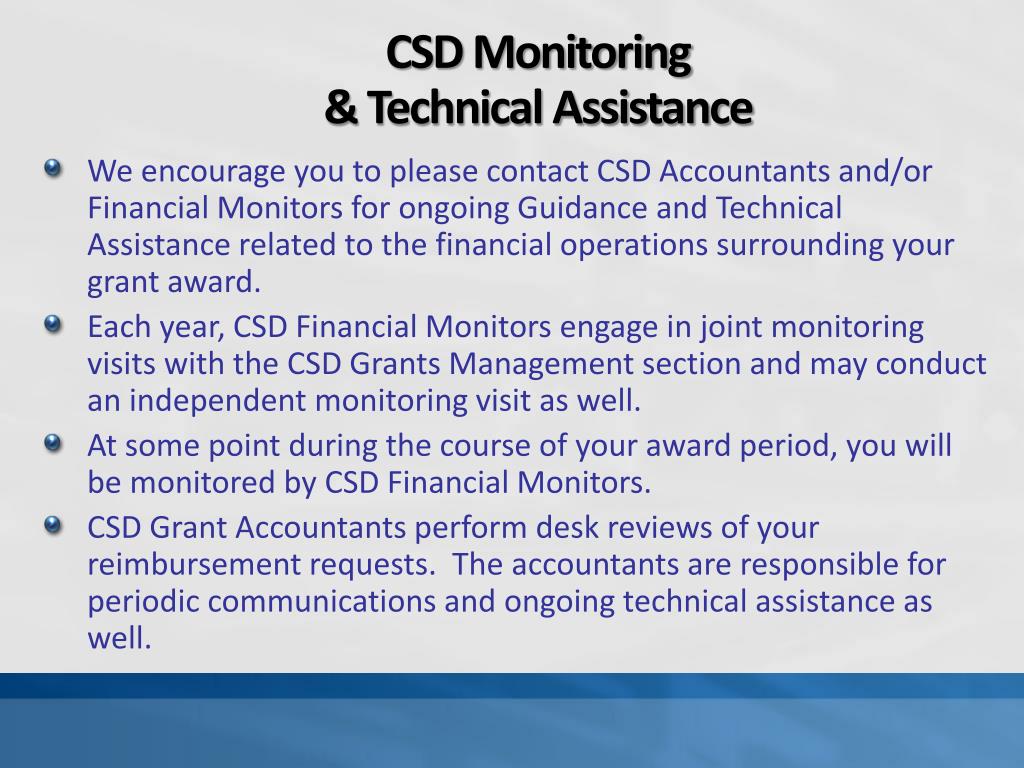 CSD Monitoring& Technical Assistance • We encourage you to please contact CSD Accountants and/or Financial Monitors for ongoing Guidance and Technical Assistance related to the financial operations surrounding your grant award. • Each year, CSD Financial Monitors engage in joint monitoring visits with the CSD Grants Management section and may conduct an independent monitoring visit as well. • At some point during the course of your award period, you will be monitored by CSD Financial Monitors. • CSD Grant Accountants perform desk reviews of your reimbursement requests. The accountants are responsible for periodic communications and ongoing technical assistance as well.