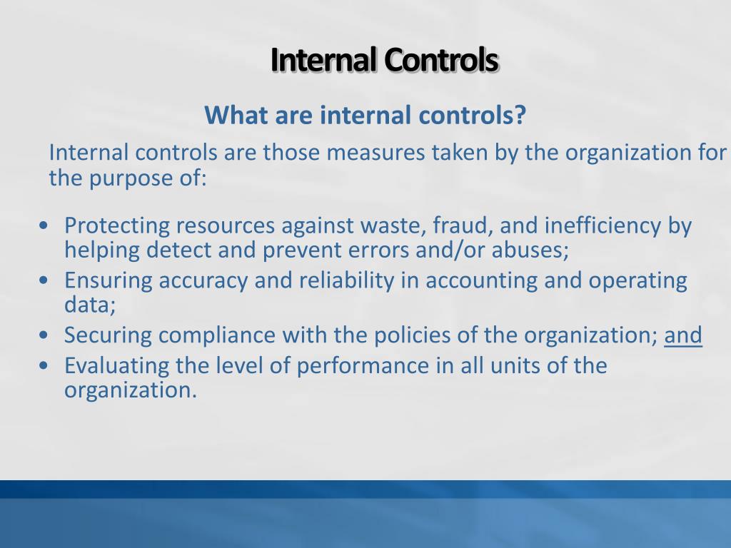 Internal Controls What are internal controls? Internal controls are those measures taken by the organization for the purpose of: • Protecting resources against waste, fraud, and inefficiency by helping detect and prevent errors and/or abuses; • Ensuring accuracy and reliability in accounting and operating data; • Securing compliance with the policies of the organization; and • Evaluating the level of performance in all units of the organization.