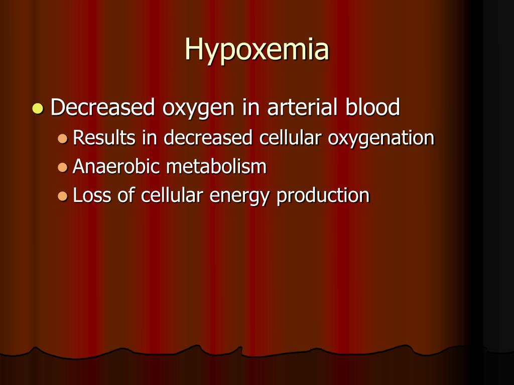 Hypoxemia • Decreased oxygen in arterial blood • Results in decreased cellular oxygenation • Anaerobic metabolism • Loss of cellular energy production