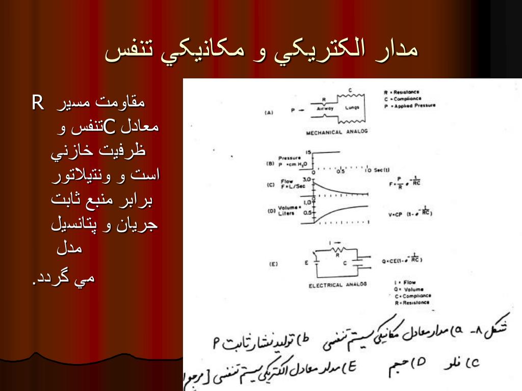 مدار الکتريکي و مکانيکي تنفس R مقاومت مسير تنفس و C معادل ظرفيت خازني است و ونتيلاتور برابر منبع ثابت جريان و پتانسيل مدل مي گردد.