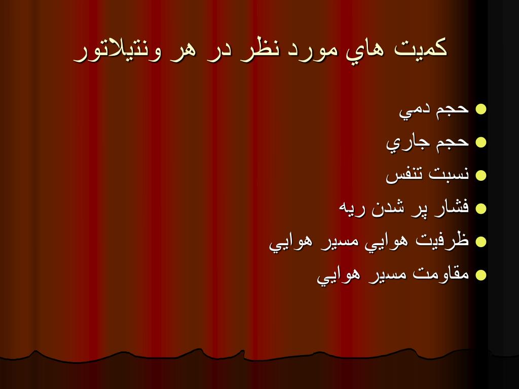 کميت هاي مورد نظر در هر ونتيلاتور • حجم دمي • حجم جاري • نسبت تنفس • فشار پر شدن ريه • ظرفيت هوايي مسير هوايي • مقاومت مسير هوايي