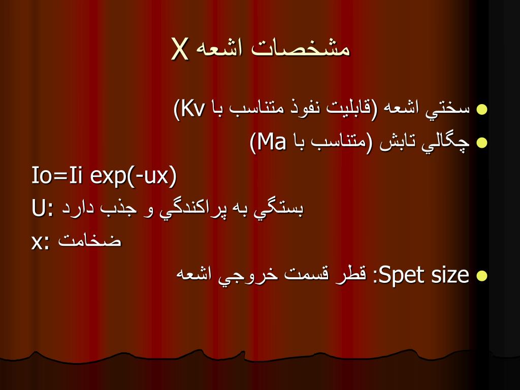 مشخصات اشعه X • سختي اشعه (قابليت نفوذ متناسب با Kv) • چگالي تابش (متناسب با Ma) Io=Ii exp(-ux) U: بستگي به پراكندگي و جذب دارد x: ضخامت • Spet size: قطر قسمت خروجي اشعه