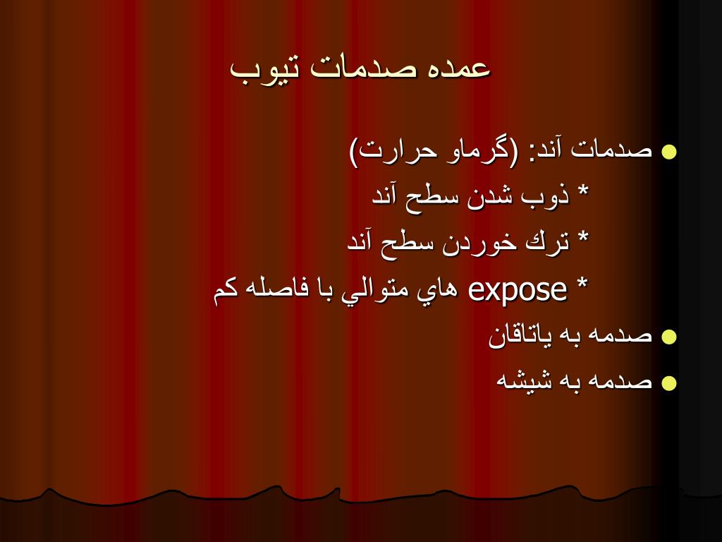عمده صدمات تيوب • صدمات آند: (گرماو حرارت) * ذوب شدن سطح آند * ترك خوردن سطح آند * expose هاي متوالي با فاصله كم • صدمه به ياتاقان • صدمه به شيشه