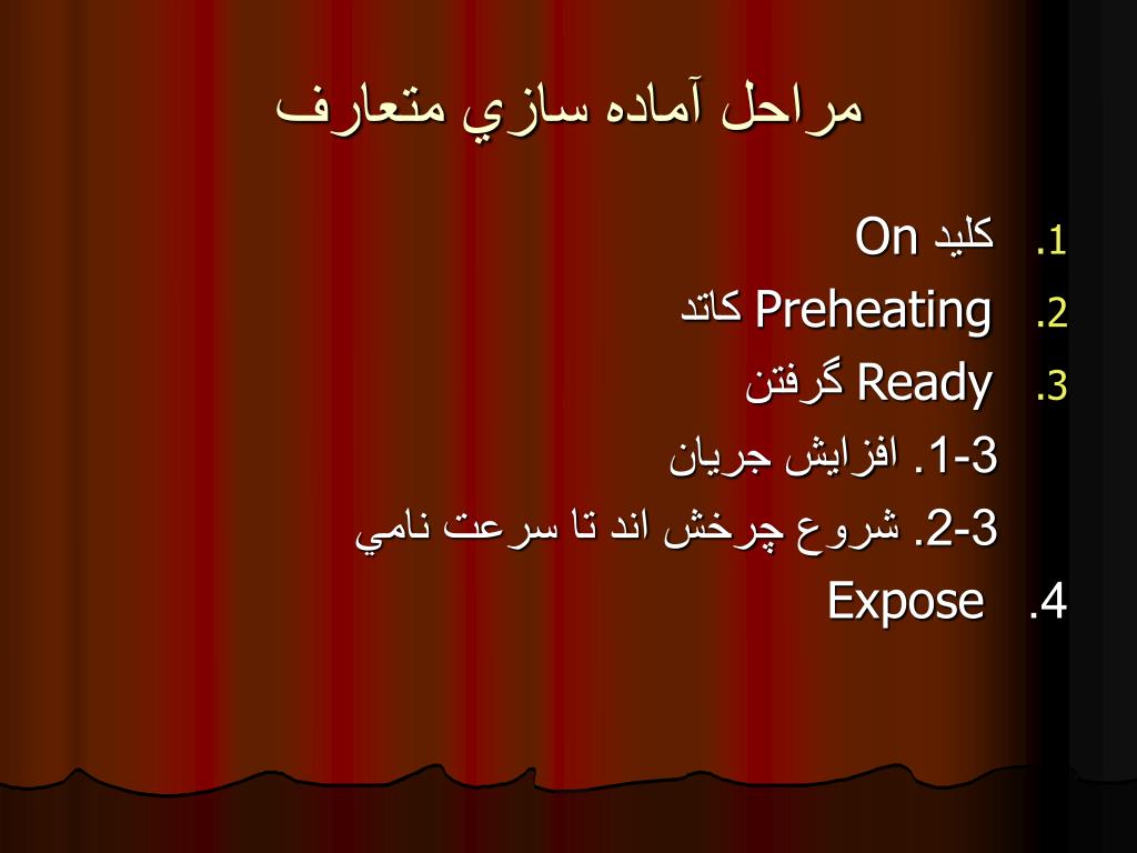 مراحل آماده سازي متعارف • كليد On • Preheating كاتد • Ready گرفتن 3-1. افزايش جريان 3-2. شروع چرخش اند تا سرعت نامي 4. Expose