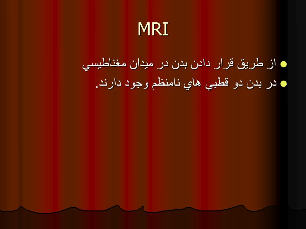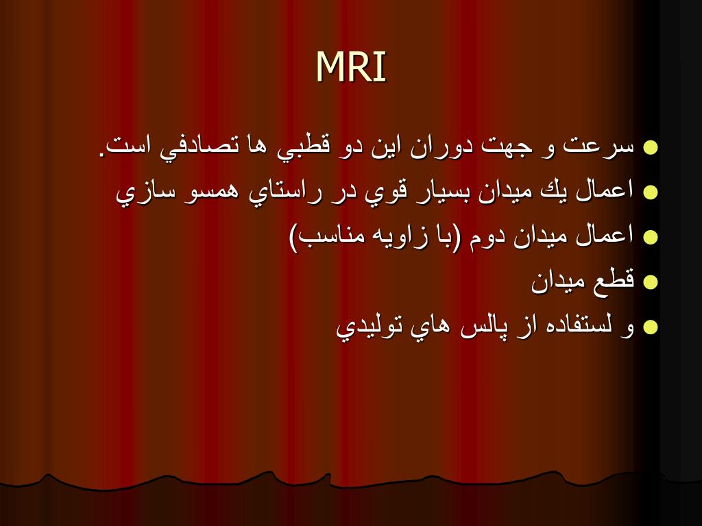 MRI • از طريق قرار دادن بدن در ميدان مغناطيسي • در بدن دو قطبي هاي نامنظم وجود دارند.