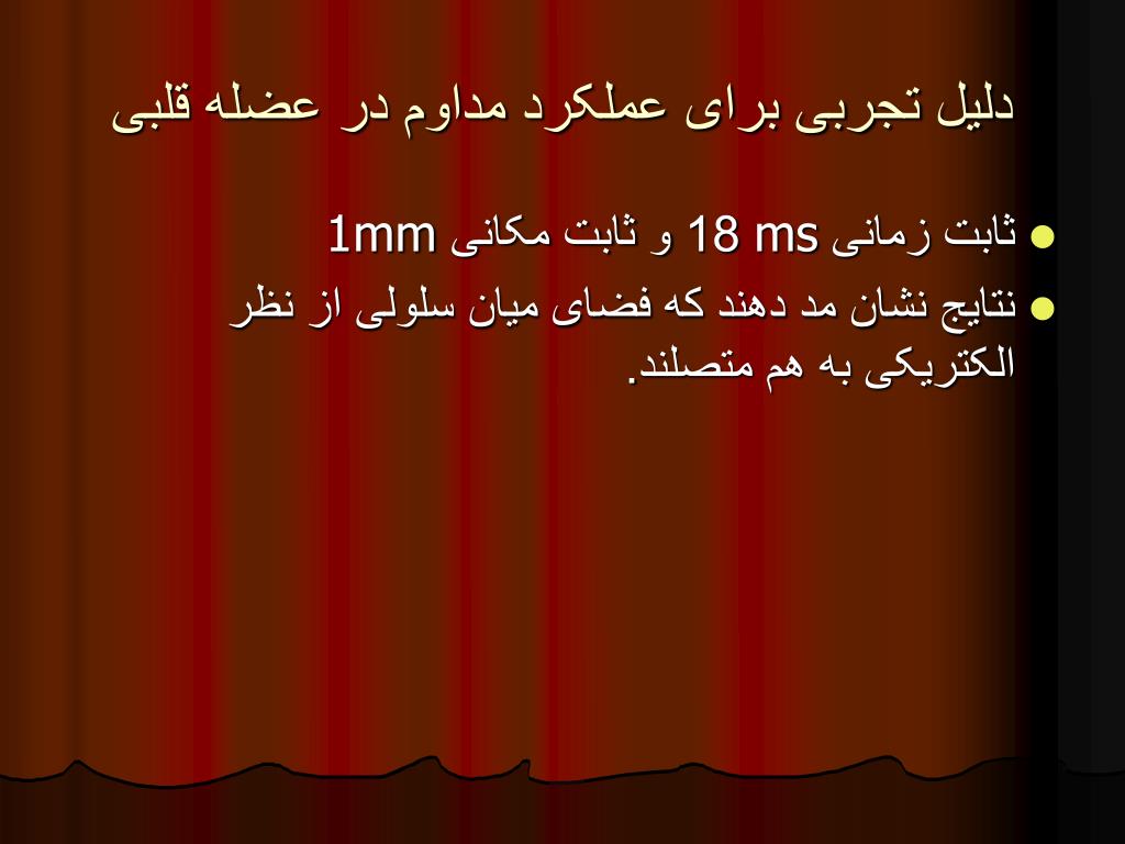 دلیل تجربی برای عملکرد مداوم در عضله قلبی • ثابت زمانی ms 18 و ثابت مکانی 1mm • نتایج نشان مد دهند که فضای میان سلولی از نظر الکتریکی به هم متصلند.