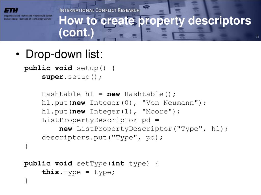 How to create property descriptors (cont.) • Drop-down list: publicvoid setup() { super.setup(); Hashtable h1 = new Hashtable(); h1.put(new Integer(0), "Von Neumann"); h1.put(new Integer(1), "Moore"); ListPropertyDescriptor pd = new ListPropertyDescriptor("Type", h1); descriptors.put("Type", pd); } publicvoid setType(int type) { this.type = type; }