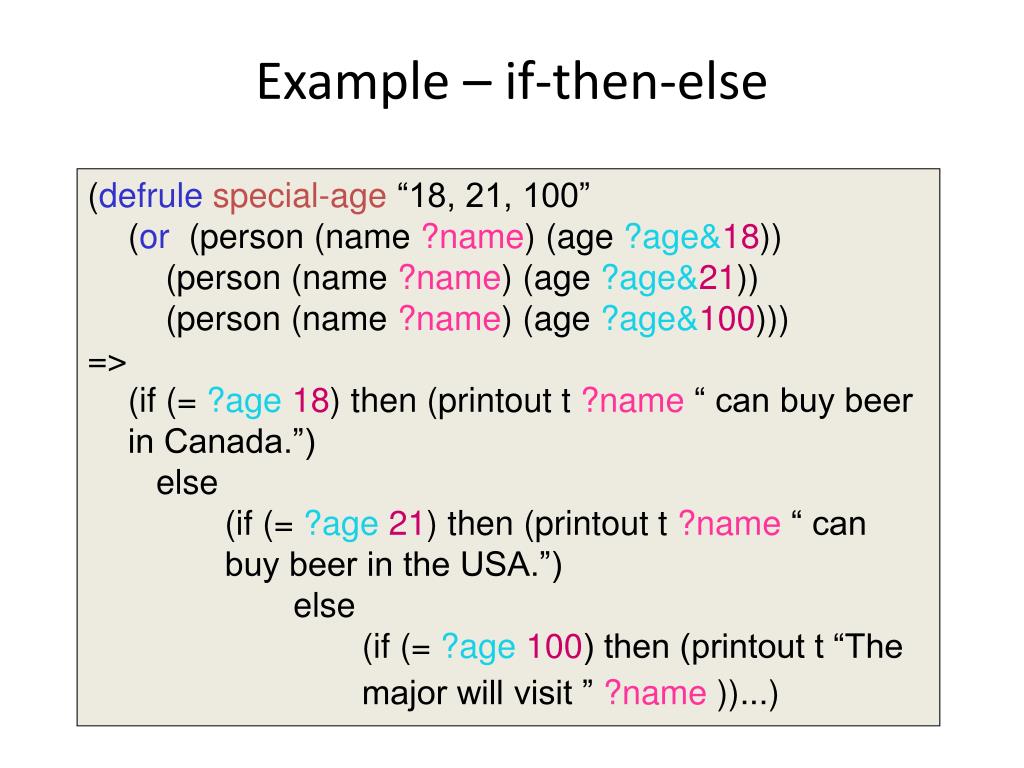 Example – if-then-else (defrule special-age “18, 21, 100” (or (person (name ?name) (age ?age&18)) (person (name ?name) (age ?age&21)) (person (name ?name) (age ?age&100))) => (if (= ?age 18) then (printout t ?name “ can buy beer in Canada.”) else (if (= ?age 21) then (printout t ?name “ can buy beer in the USA.”) else (if (= ?age 100) then (printout t “The major will visit ” ?name ))...)