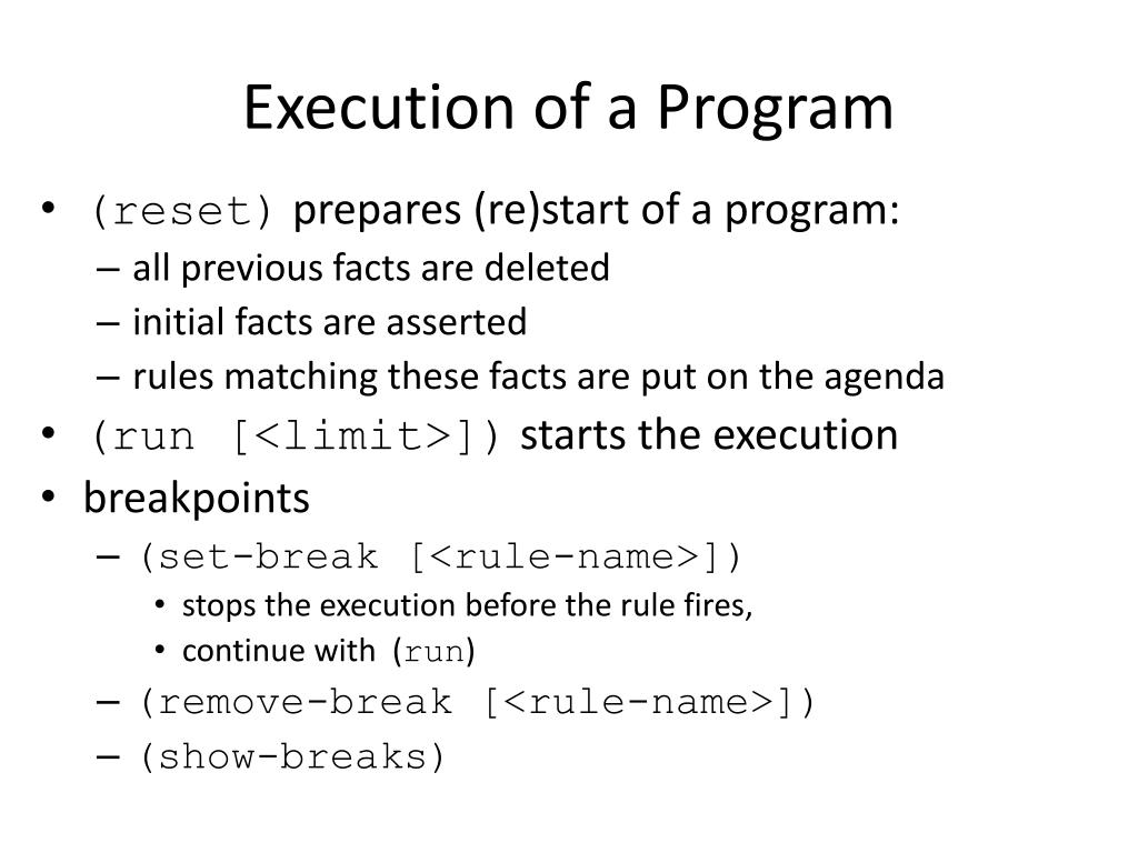 Execution of a Program • (reset) prepares (re)start of a program: • all previous facts are deleted • initial facts are asserted • rules matching these facts are put on the agenda • (run [<limit>]) starts the execution • breakpoints • (set-break [<rule-name>]) • stops the execution before the rule fires, • continue with (run) • (remove-break [<rule-name>]) • (show-breaks)