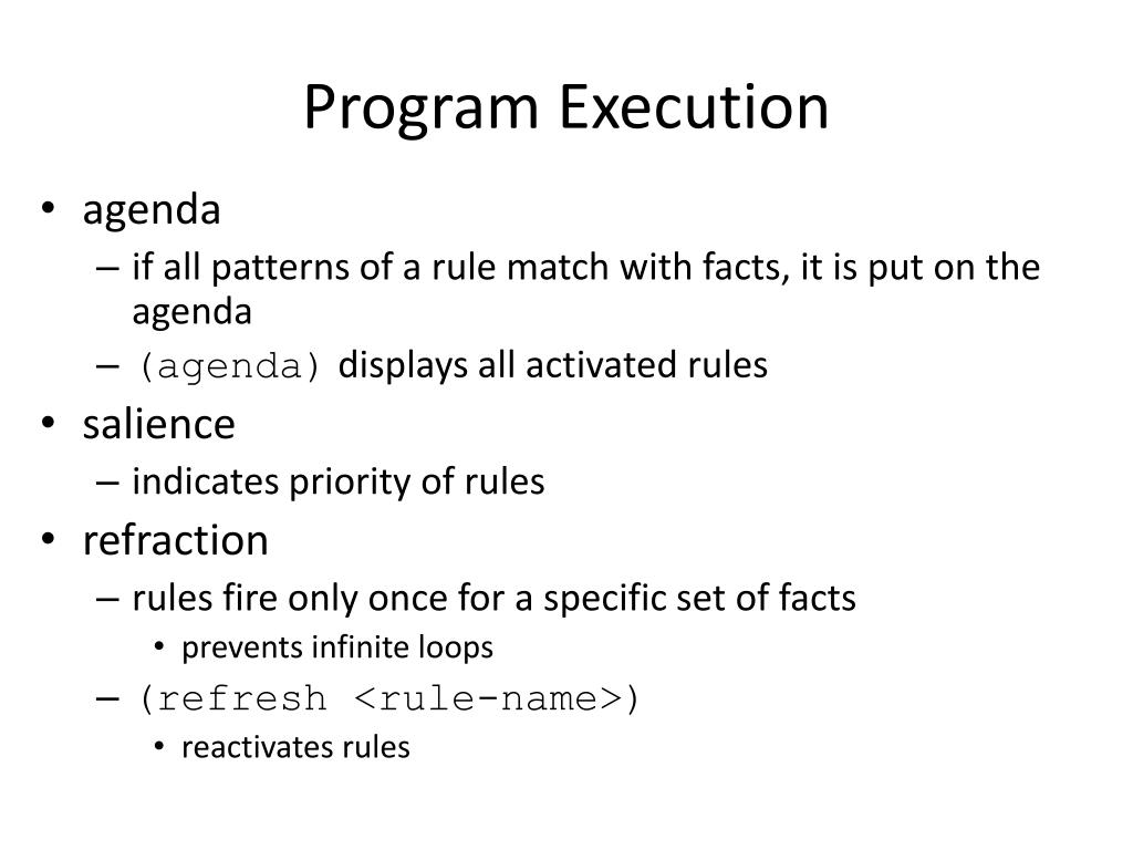 Program Execution • agenda • if all patterns of a rule match with facts, it is put on the agenda • (agenda) displays all activated rules • salience • indicates priority of rules • refraction • rules fire only once for a specific set of facts • prevents infinite loops • (refresh <rule-name>) • reactivates rules