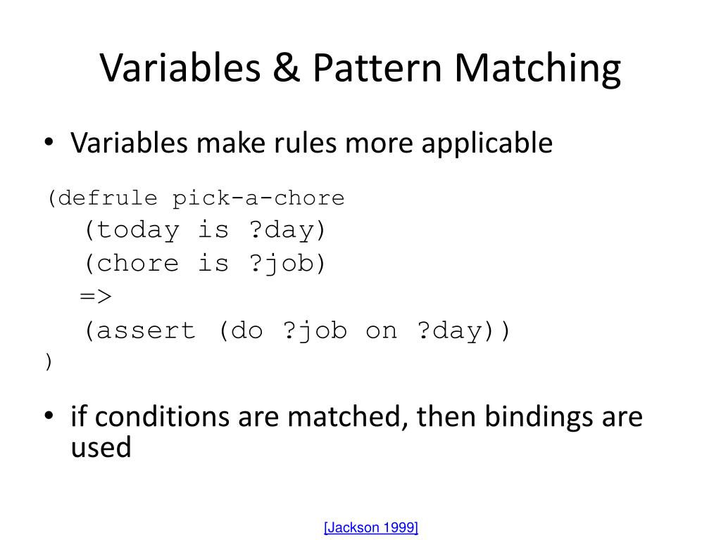 Variables & Pattern Matching • Variables make rules more applicable (defrule pick-a-chore (today is ?day) (chore is ?job) => (assert (do ?job on ?day)) ) • if conditions are matched, then bindings are used [Jackson 1999]