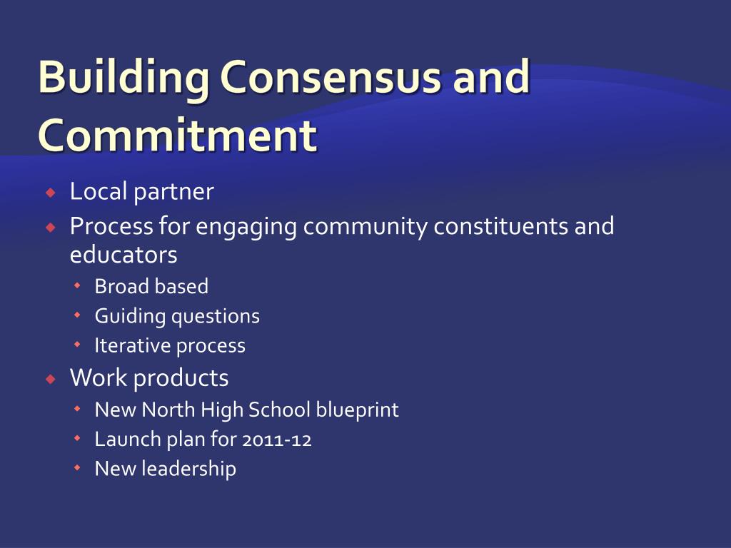 Building Consensus and Commitment • Local partner • Process for engaging community constituents and educators • Broad based • Guiding questions • Iterative process • Work products • New North High School blueprint • Launch plan for 2011-12 • New leadership