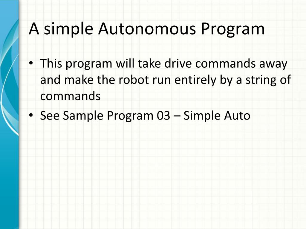 A simple Autonomous Program • This program will take drive commands away and make the robot run entirely by a string of commands • See Sample Program 03 – Simple Auto