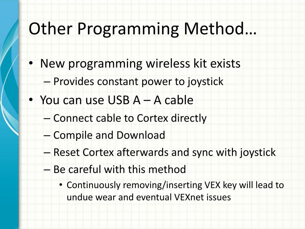 Other Programming Method… • New programming wireless kit exists • Provides constant power to joystick • You can use USB A – A cable • Connect cable to Cortex directly • Compile and Download • Reset Cortex afterwards and sync with joystick • Be careful with this method • Continuously removing/inserting VEX key will lead to undue wear and eventual VEXnet issues